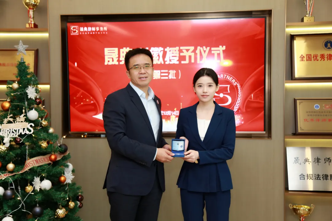 仪式之始,晟典管委会主任王永敬律师在致辞中阐述到:虽然律所人员流动比较频繁,但每位律师都能在律所的文化制度熏陶下得到成长。所徽作为律所的标志物,体现了晟典“诚、合、平”三位一体的文化基调。希望通过颁发所徽的方式,欢迎新同事加入,并拉近彼此的距离。同时,也祝愿大家在晟典工作顺利,一直与晟典同行。