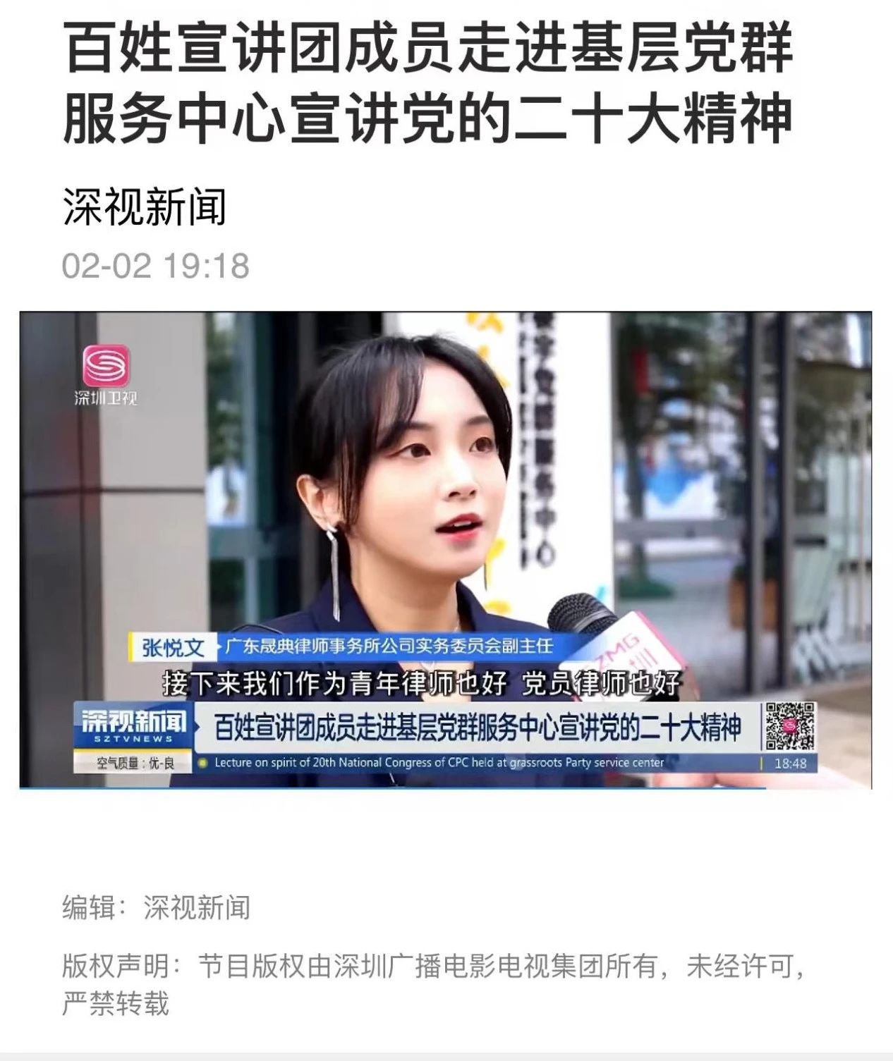 in order to deeply study and implement the spirit of the 20th national congress of the party, on the morning of February 2, 2023, the CPC Guangdong shengdian law firm Committee (hereinafter referred to as" shengdian party Committee ") organized branch secretaries and party members to participate in the" new era, new youth and new mission "activity organized by the party organization of Shenzhen international innovation center. This event specially invited Comrade Zeng Fen of Shenzhen Vocational and Technical College to give lectures, and invited reporters from Shenzhen Satellite TV, Shenzhen Special Zone News, Jingbao, and District Finance Media Center to interview.