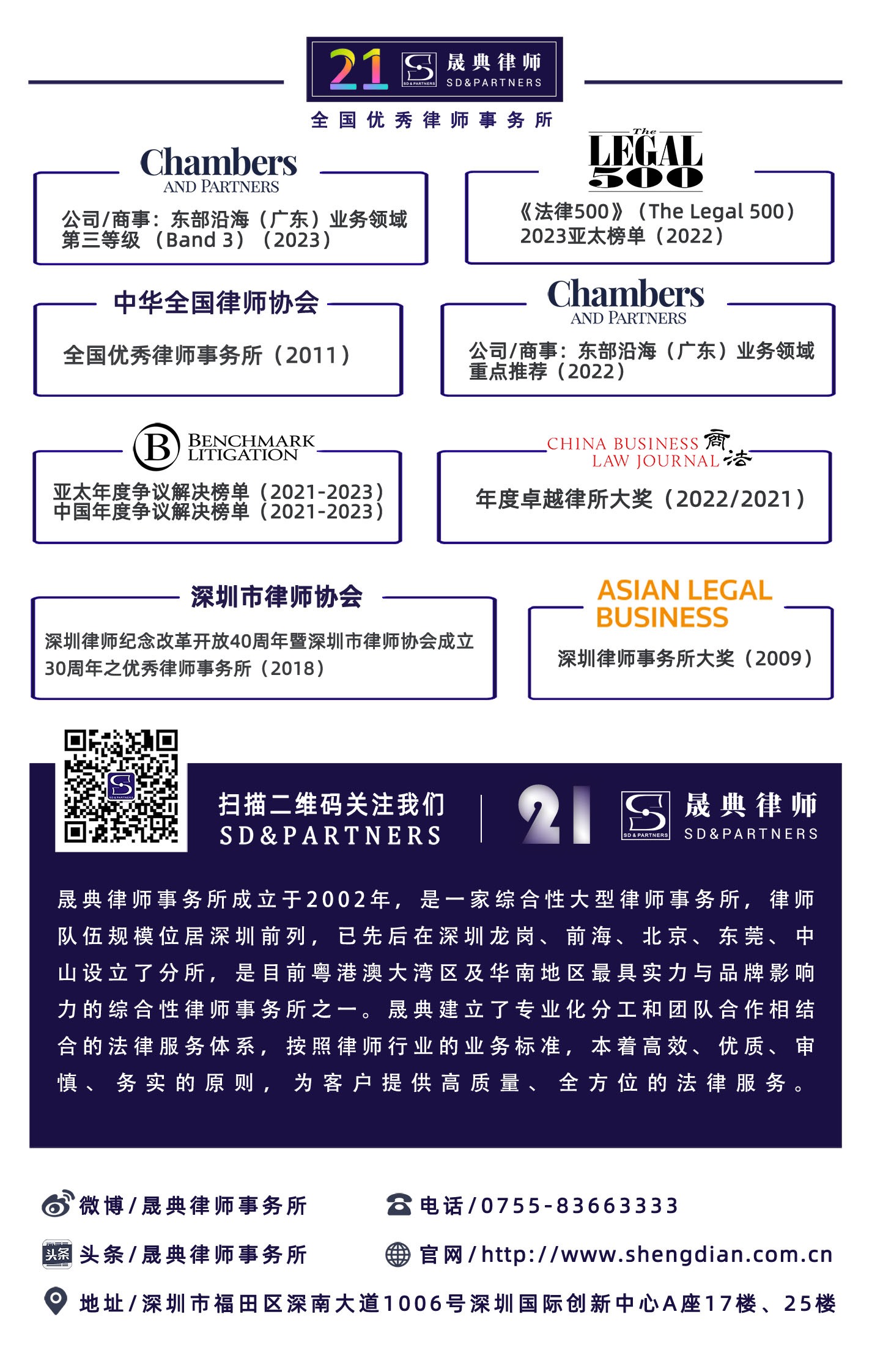 He is now a partner and lawyer of Shengdian Law firm, director of the Civil and Commercial dispute Resolution Committee of Shengdian Law firm, a representative of the 10th Shenzhen lawyers' Congress, a trainee of the Law School of Renmin University of China, a member of the tax League's "Thousand tax lawyers Incubation and training Plan", and a member of the 11th High-end Manufacturing equipment Legal Professional Committee of Shenzhen Bar Association. The the People's Republic of China Securities Regulatory Commission grants the qualification of independent director of listed companies, the Ministry of Human Resources and Social Security of the Ministry of the People's Republic of China and the Ministry of Housing and Urban-Rural Development jointly awarded the the People's Republic of China real estate agent qualification (national certificate). He was the editor-in-chief of "Central Plains Law Case Book" and the deputy editor-in-chief of "Shengdian Lawyer Review". He was the first "Niu Lawyer" in Shenzhen real estate field certified by "Niu Law Net" and the winner of the title of "Professional Model" of Shengdian Law Firm.