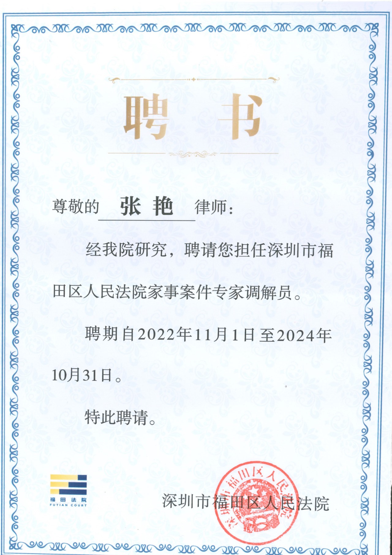 (the picture shows the letter of appointment issued by the people's court of Futian district, Shenzhen)