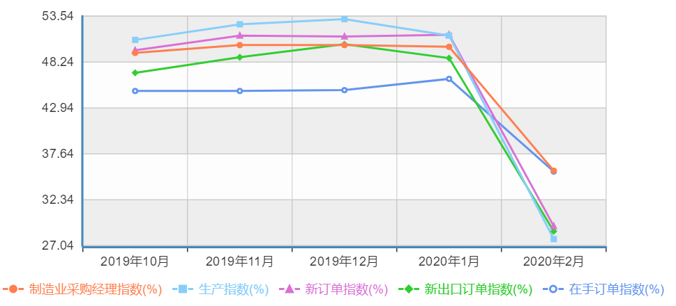 (http://data.stats.gov.cn/search.htm?s=PMI)于2020年2月29日公布的PMI(采购经理指数),2020年2月综合PMI产出指数为28.9%,相比上月下降24.1个百分点;其中制造业PMI为35.7%,相比上月下降29.6%,非制造业PMI为29.6%,相比上月下降24.5个百分点。前述数据创2005年国家统计局推出统计数据以来的最低值。