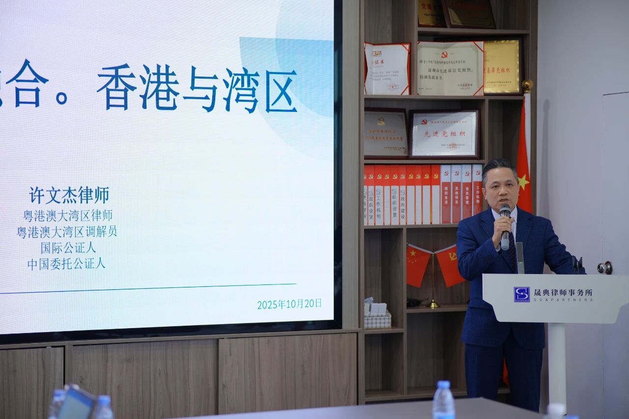 2025年10月20日下午,由深圳市前海国际商事调解中心(以下简称“调解中心”)主办、晟典律师事务所(以下简称“晟典”)承办的“湾区调解员”主题宣传活动第八期——“调解大融合,香港与湾区”,在晟典17楼大会议室圆满举行。