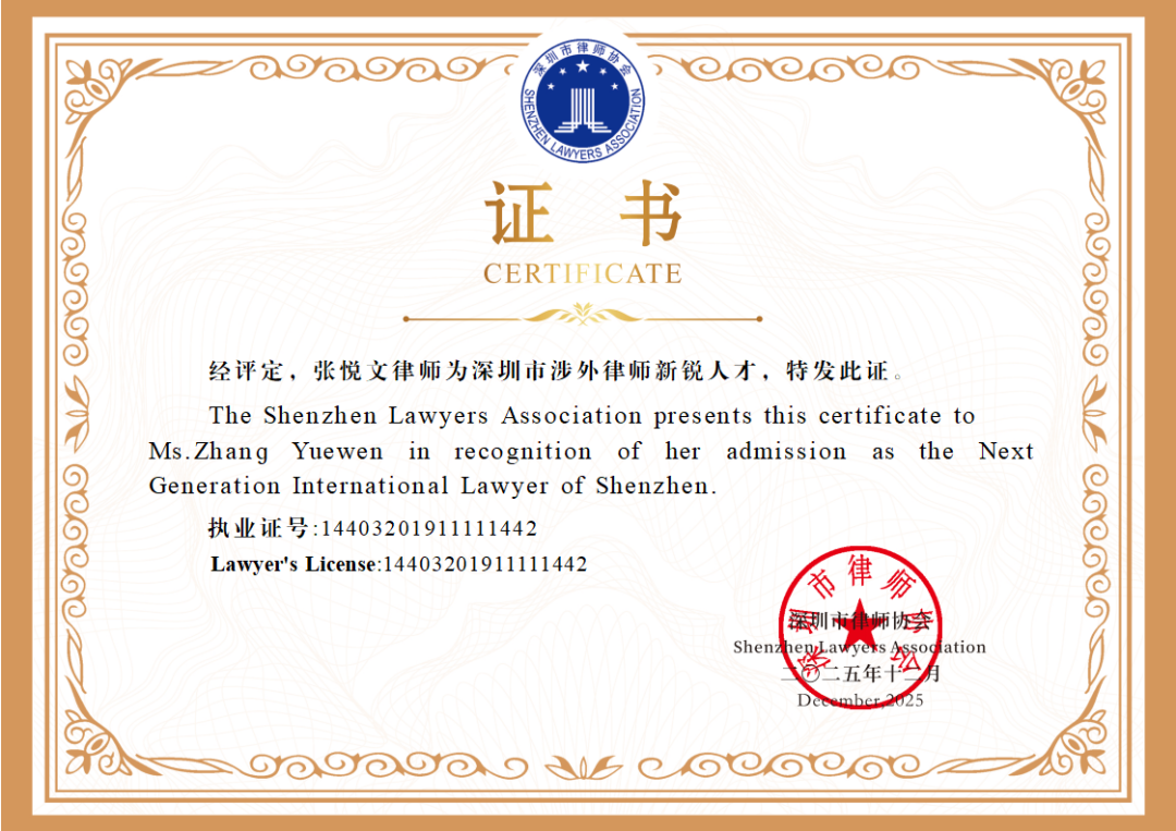 (深圳市涉外律师新锐人才证书)